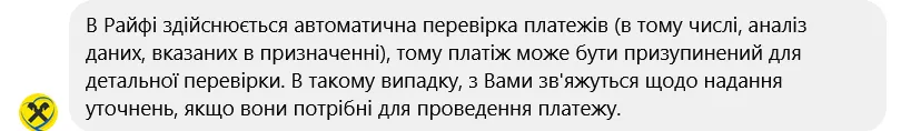 А в тому ж “Райффайзен Банк Україна” зазначили, що здійснюють автоматичну перевірку платежів – зокрема аналіз даних, вказаних у призначенні. І у разі необхідності “платіж може бути призупинений для детальної перевірки”.