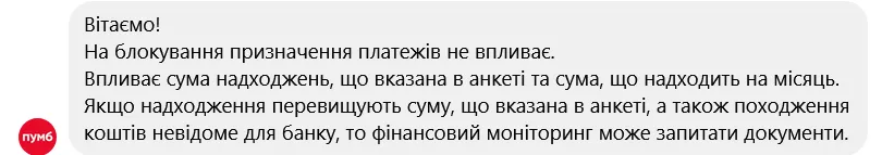 “На блокування призначення платежів не впливає. Впливає сума надходжень, яка вказана в анкеті (дані, які клієнт подавав банку під час відкриття рахунку. – Ред.) та сума, що надходить на місяць. Якщо надходження перевищують суму, яка вказана в анкеті, а також походження коштів невідоме для банку, то фінансовий моніторинг може запитати документи”, – розповіли у ПУМБ.
