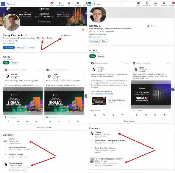 Проте, основний доказ спорідненості двох проектів – спільні працівники. Згідно з профілями на Linkedin ключові «співробітники» Thedex поєднують роботу і в Bill_line. Так, наприклад, Danny Panchenko вказує, що з 2024 року працює і в Thedex.cloud, і в Bill_line одночасно до сьогодні. Аналогічну інформацію вказує і хтось Dmitriy Z., який з квітня 2024 займається технічною підтримкою в Bill_line і одночасно працює менеджером в Thedex.cloud.