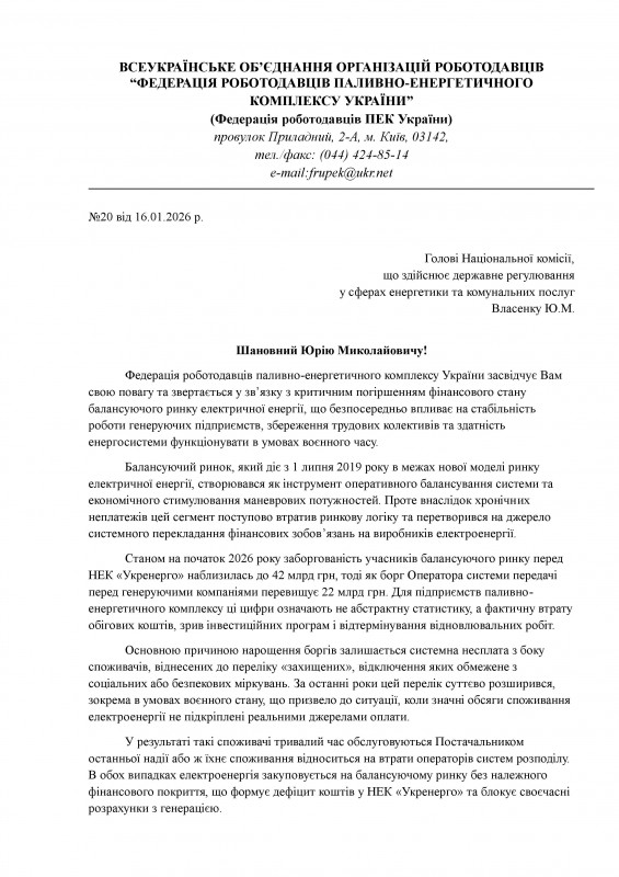 У Федерації закликають до комплексних регуляторних рішень – від взаємозаліків боргів до перегляду переліку захищених споживачів – аби зупинити накопичення заборгованості та відновити платіжну дисципліну на балансуючому ринку.