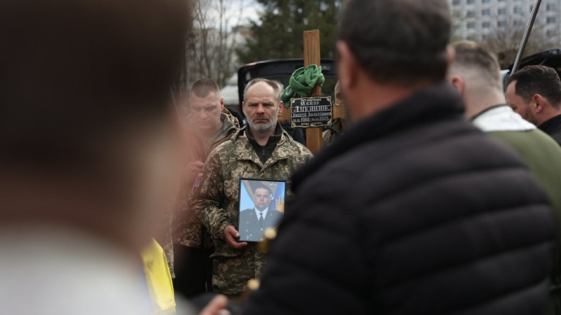Військовий тримає портрет загиблого Андрія Луканюка. Фото: Марія Ігнатюк / Суспільне Чернівці