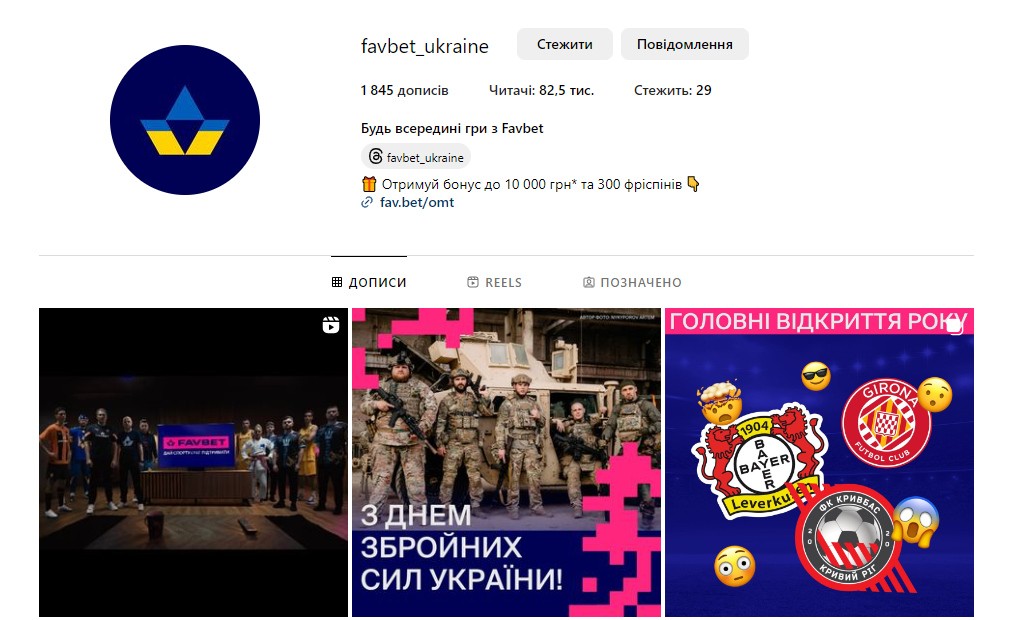 Favbet_Foundation — сторінка благодійного фонду Favbet Foundation. Благодійна організація компанії з перших днів війни дуже активно допомагає ЗСУ та українцям, тож тут можна знайти багато звітів та анонсів нових проєктів. До багатьох з них можна долучитись безпосередньо на сторінці — наприклад, нещодавно фонд проводив безкоштовні курси програмування для дітей, а також влаштовував для дітлахів спортивні секції.