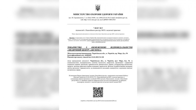 Ліцензія на роботу “Медичного центру “Аксіома” у Чернігові. ФОТО: aksioma.clinic