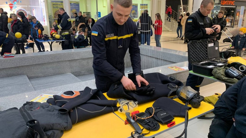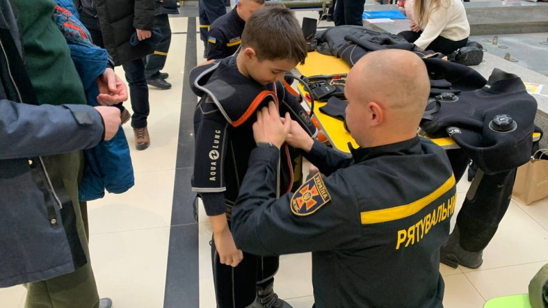 На іншій локації водолази розповіли дітям правила поводження на водоймах. А також, що варто робити, якщо хтось тоне. Щоб було цікавіше слухати теорію, дітям дозволили приміряти спорядження водолазів.