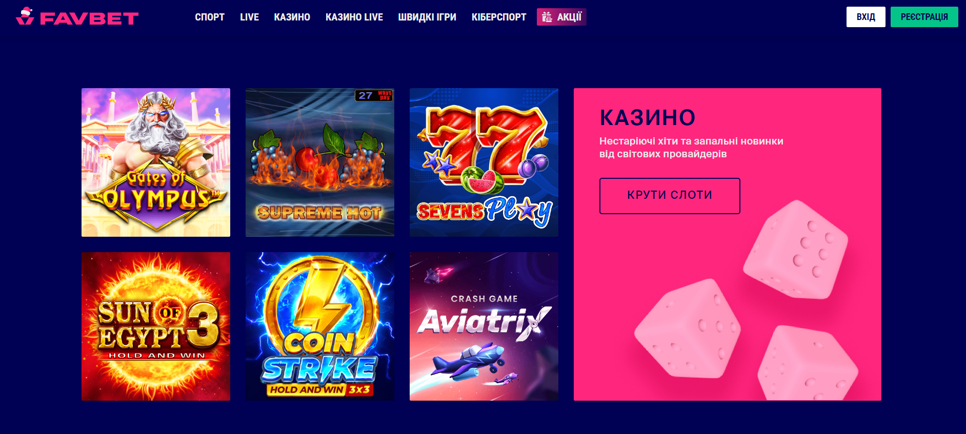 FAVBET пропонує величезний вибір азартних розваг, включаючи: