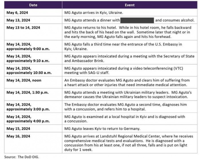 Скриншот | дані звіту про візит генерала зі США Антоніо Агуто до КиєваРозслідувачі дійшли до висновку, що впав Агуто саме через алкогольне сп’яніння. Генерал не врахував можливих наслідків від надмірного захоплення чачею та не мав відповідного дозволу на вживання алкогольних напоїв у таких дозах.