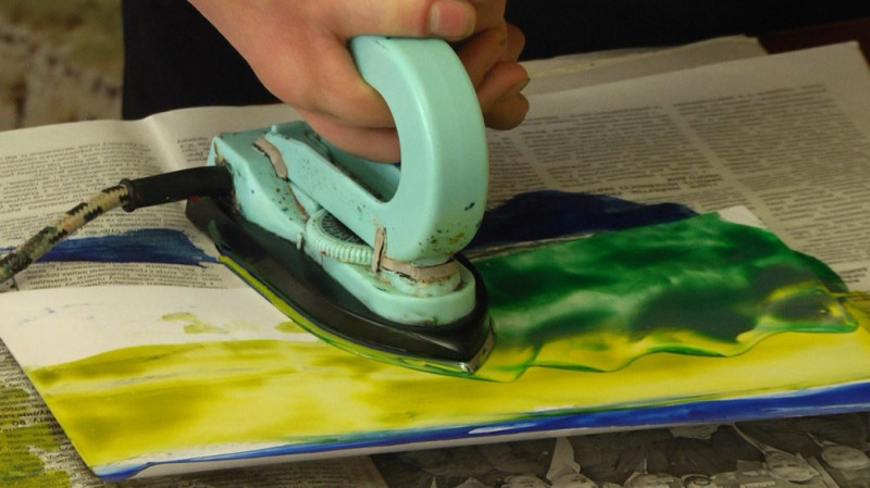 "Техніка називається "енкаустика". У перекладі – "Я малюю воском". За допомогою воскових олівців і гарячої праски ми їх плавимо. І у нас на прасці виходить наша фарба, яка нам треба. Потім беремо цю фарбу на прасці й переносимо на глянцевий папір", — розповідає майстер з малювання праскою Кирило Богданюк.