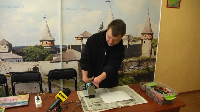 Зараз Кирило вчить малюванню праскою у художній студії, яка працює у навчально-реабілітаційному закладі вищої освіти “Кам’янець-Подільський державний інститут”. 8 грудня 2022 рік. Фото: Суспільне Хмельницький