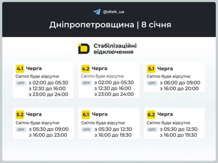 Графіки відключень світла на 8 січня для 4–6 черг у Дніпропетровській області Фото: ДТЕК