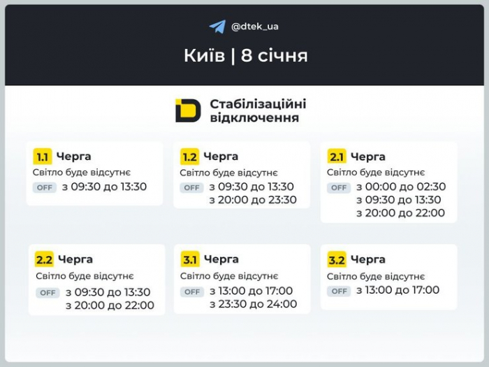 Графіки відключень світла на 8 січня для 1–3 черг у Києві Фото: ДТЕК
