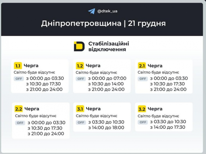 Графіки відключень світла на 21 грудня для 1-3 черг у Дніпропетровській області
