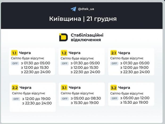 Графіки відключень світла на 21 грудня для 1-3 черг у Київській області