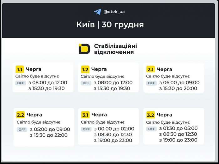 Графіки відключень світла на 30 грудня для 1–3 черг у Києві Фото: ДТЕК