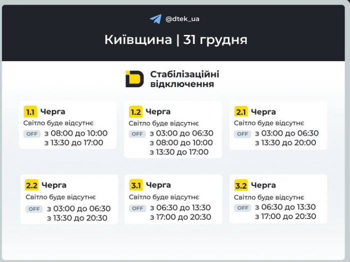 Графіки відключень світла на 31 грудня для 1–3 черг у Київській області Фото: ДТЕК