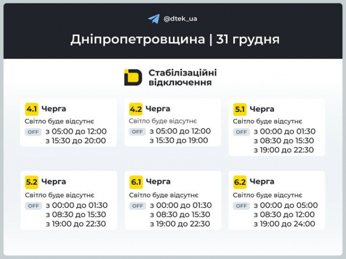Графіки відключень світла на 31 грудня для 4–6 черг у Дніпропетровській області Фото: ДТЕК