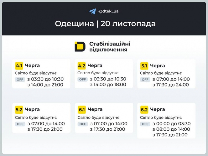 Графіки відключень світла на 20 листопада для 4-6 черг у Одеській області Фото: ДТЕК