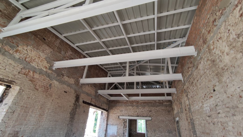 Встановили металевий каркас під дах над центральною частиною будівлі. Фото: Суспільне Полтава
