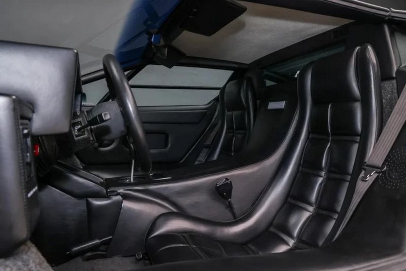 Салон Lamborghini Countach LP 5000 QV оздоблений чорною шкірою. Комплектація включає золотисті 15-дюймові диски, кондиціонер, магнітолу Alpine та велетенське антикрило.