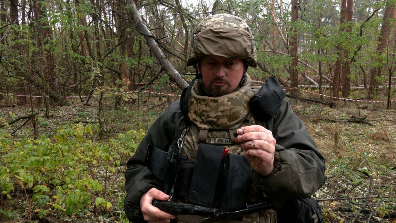 Олександр Подобєд — сапер підрозділу Державної спеціальної служби транспорту. Крок за кроком він обстежує ділянку лісового масиву неподалік Чернігова.
