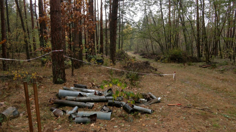 Залишки снарядів від “Ураганів” та “Градів” на Чернігівщині. ФОТО: Суспільне Чернігів"При пересуванні по лісу, по-перше, вони руйнують позначки на місцевості, де проходять ту, чи іншу ділянку сапери. А також це є небезпечним для їхнього життя. Коли вони будуть проходити якусь з ділянок можливе спрацювання розтяжки й до тієї людини буде проблематично добратися, щоб надати допомогу", — говорить Владислав Гулич.
