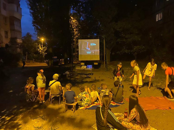 Тож прямо до двору за запрошенням мешканців приїжджає пересувний кінотеатр. Поки малеча дивиться мультики дорослі за бажанням можуть задонатити на ЗСУ.