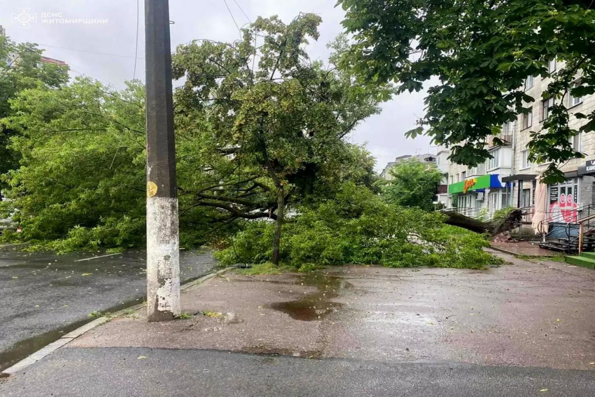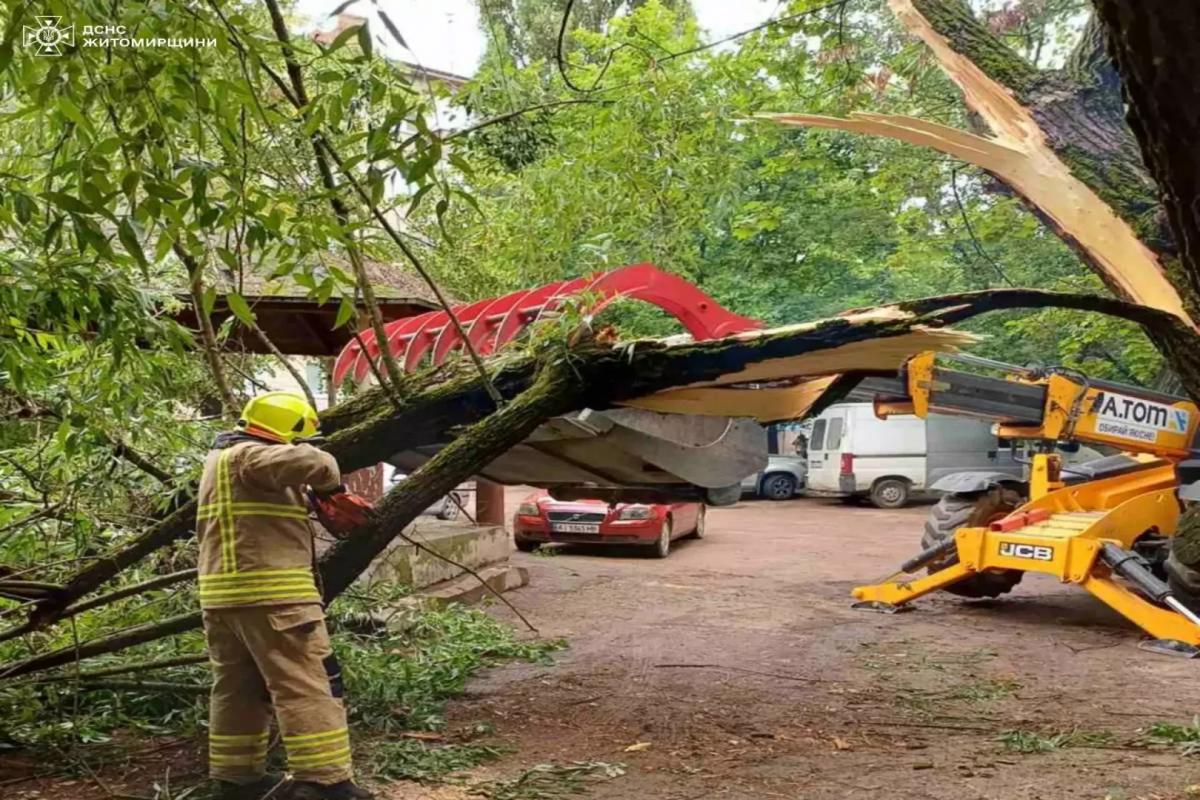 Зокрема, 11 червня о 09:13 до Служби порятунку “101” надійшло повідомлення про те, що необхідна допомога рятувальників у прибиранні дерева в м. Коростень. Як з’ясувалося, внаслідок поривів вітру гілка впала на поруч припаркований автомобіль. Бійці ДСНС спільно з місцевими жителями відтягнули її на узбіччя дороги.