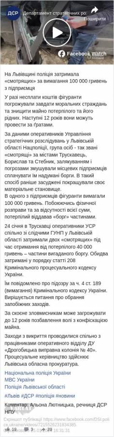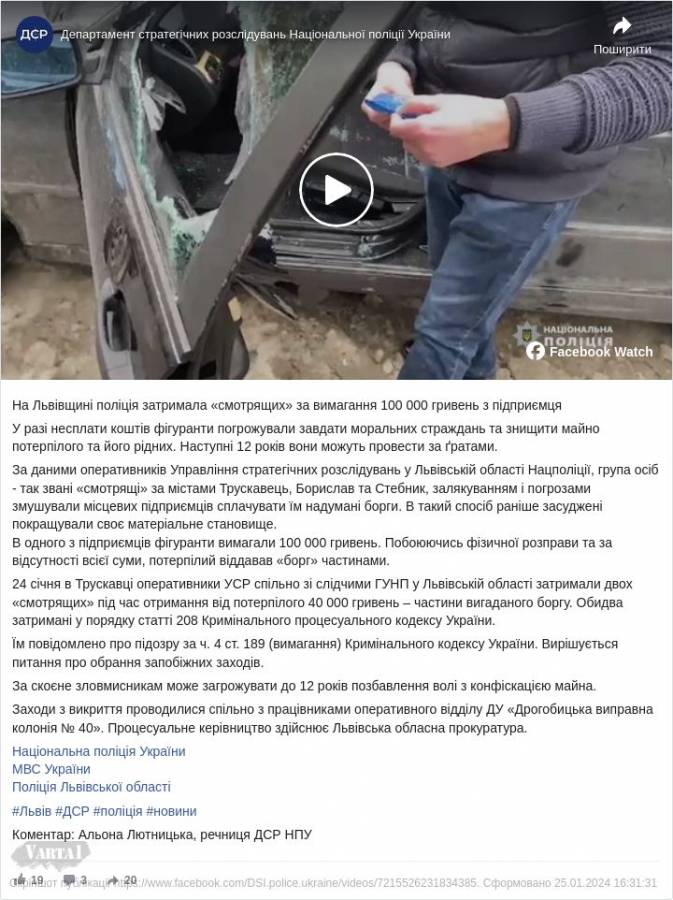 За даними оперативників Управління стратегічних розслідувань у Львівській області Нацполіції, група осіб – так звані «смотрящі» за містами Трускавець, Борислав та Стебник, залякуванням і погрозами змушували місцевих підприємців сплачувати їм надумані борги. В такий спосіб раніше засуджені покращували своє матеріальне становище.