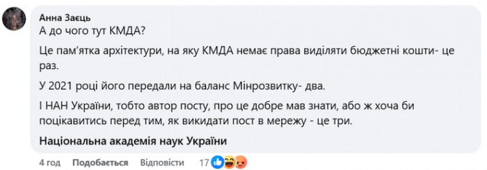 В коментарях користувачка Анна Заєць наголосила, що у 2021 році міст Патона було передано на баланс Міністерства розвитку, і КМДА не має права виділяти бюджетні кошти на ремонт пам’ятки архітектури. В КМДА у 2023 році також зазначали, що зазначений позакласний міст у 2021-му було за наполяганням Уряду, Міністерства розвитку громад, територій та інфраструктури України передано для ремонту у проєкт “Велике будівництво”.