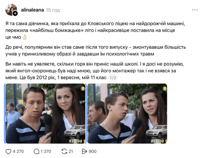 Колишня учениця ліцею Аліна, яка знімалася у програмі Олексія Дурнєва на телеканалі ТЕТ, вийшла на зв’язок у Threads і пригадала закулісся створення одного з найпопулярніших випусків. Саме вона запам’яталася глядачам як дівчина, що приїхала до школи на дорогому автомобілі та розповідала про елітний відпочинок.