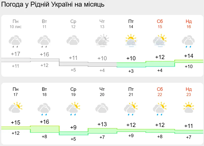 Згідно з прогнозом метеорологині Наталки Діденко, доволі комфортна температура повітря буде триматися ще кілька днів, проте, уже з вівторка, 18 листопада, варто очікувати на суттєве похолодання.