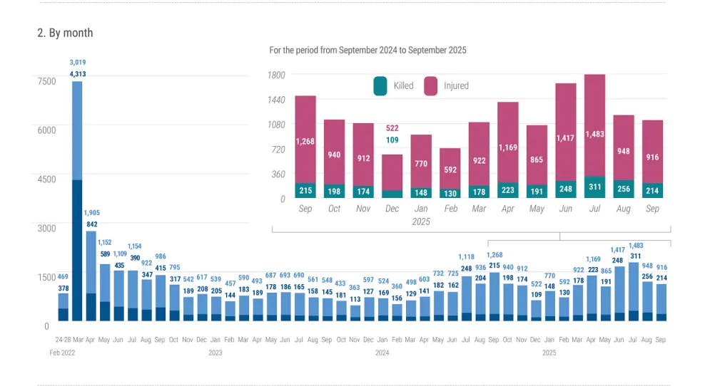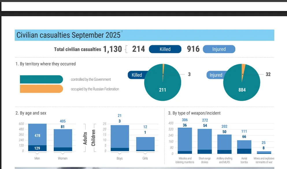 У вересні 2025 року, за даними ООН, в Україні щонайменше 214 цивільних осіб загинули та 916 отримали поранення – приблизно стільки ж мирних жителів було вбито чи травмовано у серпні.