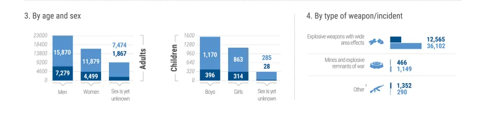 Переважна більшість жертв – 12 565 загиблих та 36 102 поранених, яких вдалося підтвердити міжнародній організації – загинули від вибухової зброї з широкою зоною дії, тобто насамперед від тих же ракет та ударних дронів.