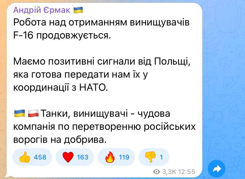 Глава ОП Андрей Ермак подтвердил решение из Варшавы и в Тelegram написал: “Работа над получением истребителей F-16 продолжается. Есть положительные сигналы от Польши, которая готова передать нам их в координации с НАТО”.