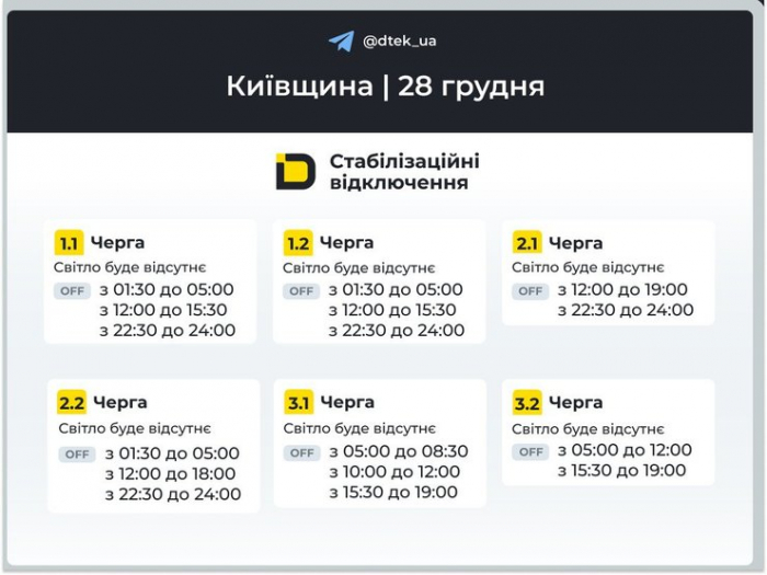 Графіки відключень світла на 28 грудня для 1-3 черг у Київській області Фото: ДТЕК