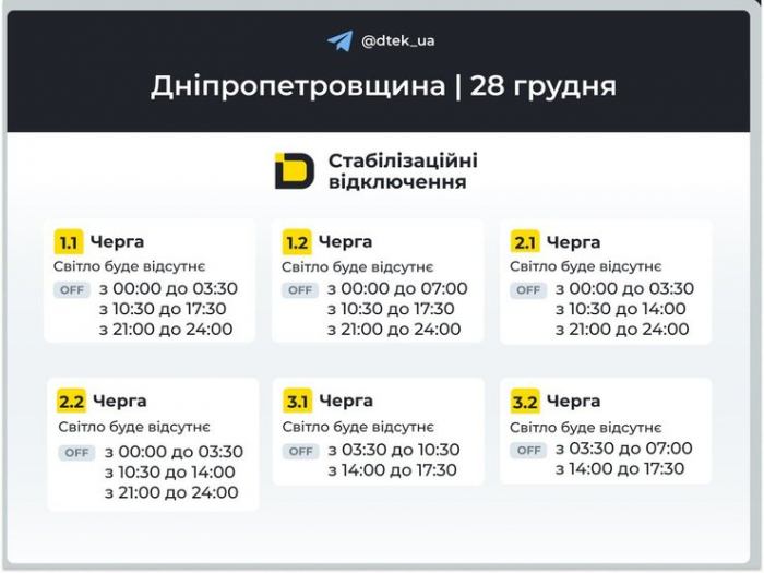 Графіки відключень світла на 28 грудня для 1-3 черг у Дніпропетровській області Фото: ДТЕК