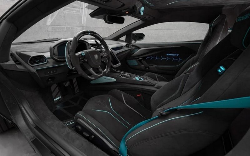 Салон Lamborghini Revuelto Mansory оздобили алькантарою із контрастними бірюзовими вставками. Карбонових деталей вистачає і всередині.