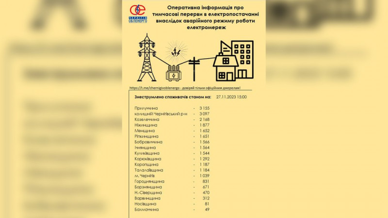 Список районів без електропостачання. ФОТО: АТ “Чернігівобленерго”