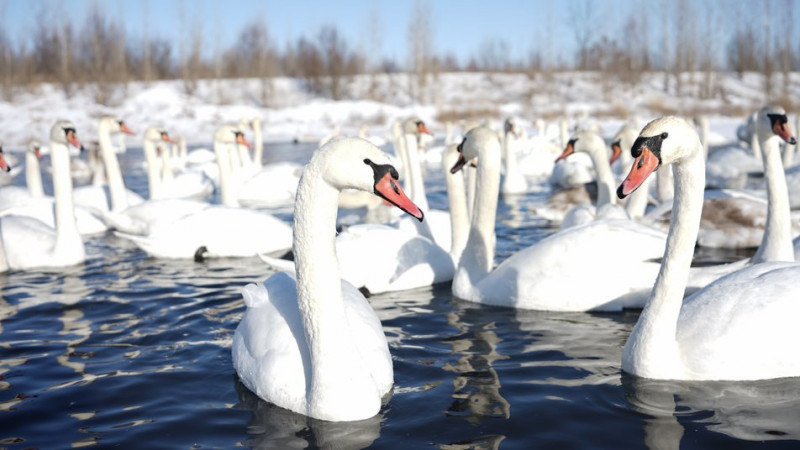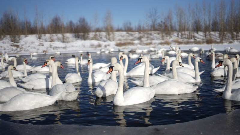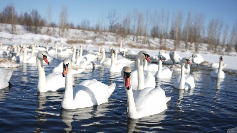 На озеро у селі Чортория Чернівецької області прилетіли зимувати понад сотня лебедів-шипунів. Їх годують сумішшю із зерна та подрібнених овочів. Також підгодовувати лебедів приходять місцеві жителі.