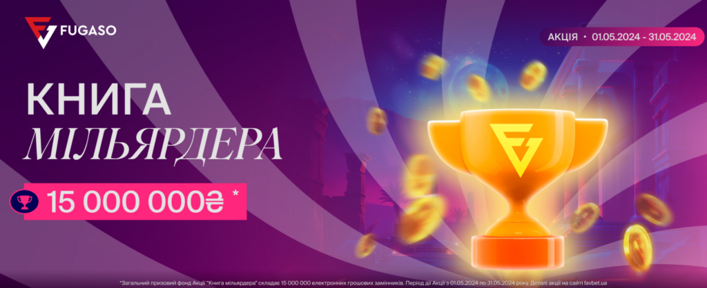 Одна з найбільших акцій травня на платформі FAVBET, що проводиться з 1 по 31 травня 2024 року з призовим фондом 15 000 000₴. Для участі потрібно грати в акційні ігри від провайдера Fugaso з мінімальною ставкою від 8₴ і заробляти бали, які відображаються в онлайн-таблиці лідерів.