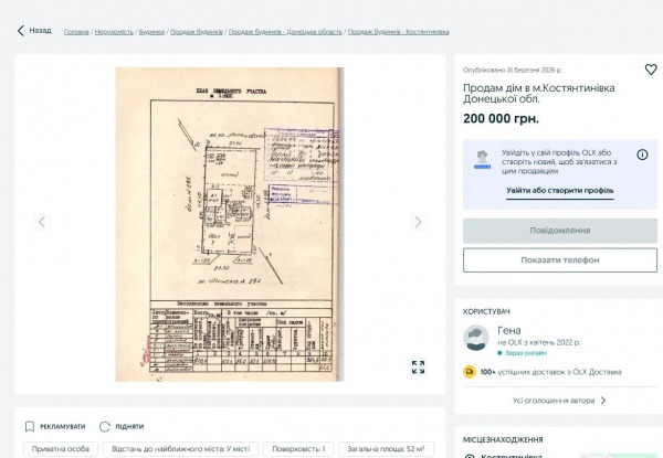 А чи продається житло у майже вже розбитій Костянтинівці, яку ворог розносить із усіх видів озброєння? Уявіть собі, два оголошення знайшлося – будинок 52 кв. метра та квартира в 61, 1 «квадрата» вартістю 200 тис. та 300 тис. грн відповідно. Щоправда, замість барвистих фото – лише техпаспорти та плани житла, рештув, мабуть, має домальовувати уява покупця, оскільки продавець перебуває на більш спокійній території та на руках у нього лише врятовані документи на нерухомість, а не фото.