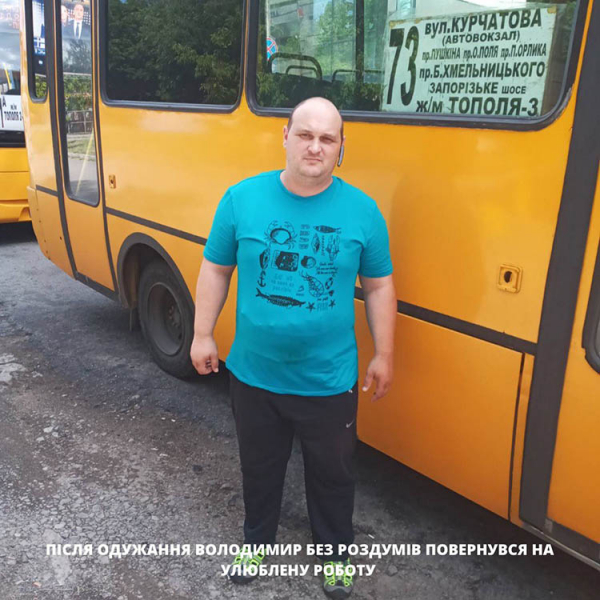 Водій автобуса Володимир Кіяшко після кількох місяців лікування повернувся на улюблену роботу – за кермо міського автобуса. Він ще 10 років тому почав працювати на 73 автобусному маршруті.