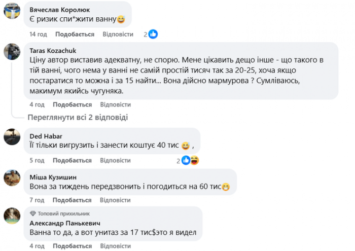 - “Ціну автор виставив адекватну, не спорю. Мене цікавить дещо інше – що такого в тій ванні, чого нема у ванні не самій простій тисяч так за 20-25, хоча якщо постаратися, то можна і за 15 найти… Вона дійсно мармурова? Сумніваюсь, максимум якийсь чугуняка”, — написав один з учасників обговорення.