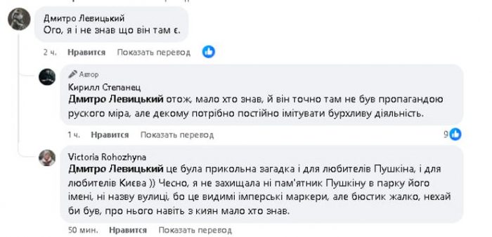Дехто з коментаторів навіть зазначав, що раніше і не знав про існування цього бюсту, і що він не був пропагандою “руського міра”, а просто частина київської історії. Інша користувачка додала, що бюст міг би залишитися “прикольною загадкою” для киян і поціновувачів Пушкіна, попри те, що не підтримує імперські маркери в інших пам’ятках.