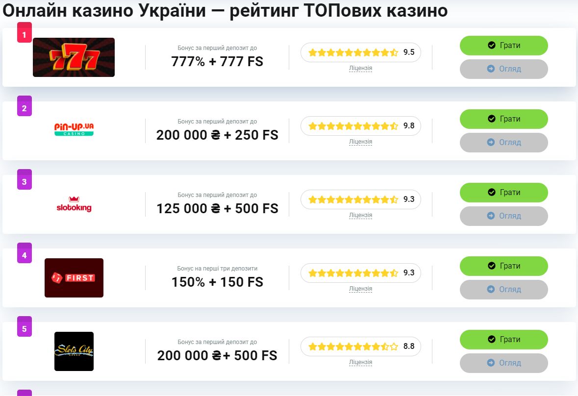 Всі топ казино України у рейтингу які пропонують бездепозитні бонуси, мають ліцензію КРАІЛ, відповідають українському законодавству та сплачують податки до бюджету.
