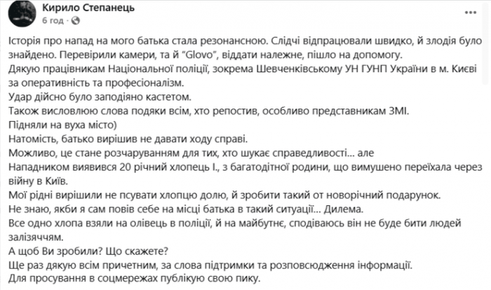 Поліція Шевченківського району столиці оперативно знайшла зловмисника, також назустріч пішла компанія Glovo, де той працює. Після перевірки даних та інформації з камер відеоспостереження було підтверджено, що кур’єр напав на батька Степанця з кастетом, вдаривши його по обличчі.