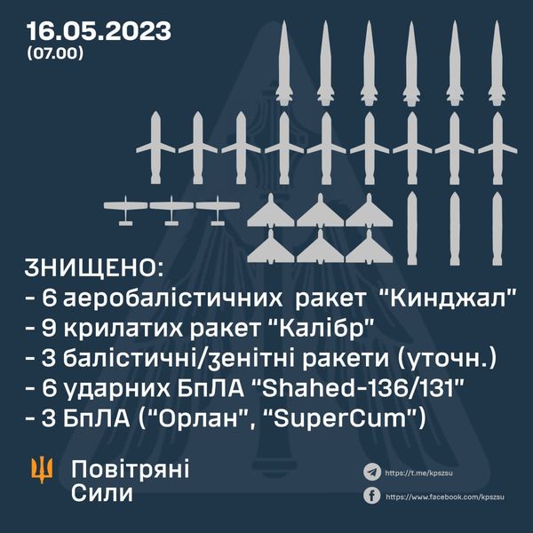 Близько 03:30 16-го травня 2023 року російські окупанти атакували Україну з північного, південного та східного напрямків 18 ракетами різних типів повітряного, морського та наземного базування.