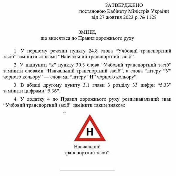 Кабмін ще 7 жовтня 2023 року ухвалив постанову №1128, згідно з якою автомобілі для практичного іспиту, а також автомобілі, на яких навчаються кандидати у водії, повинні мати позначення «Н», а не «У», як раніше.