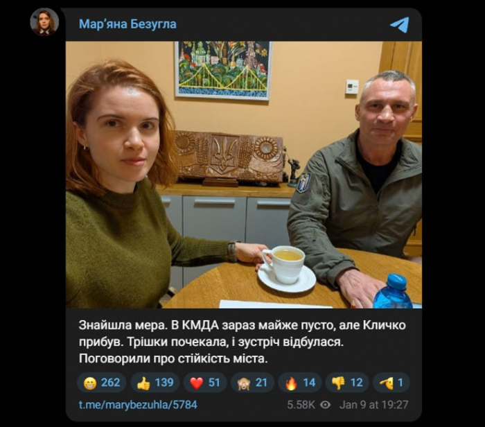 Варто зазначити, що 9 січня Мар’яна Безугла опублікувала у своєму Telegram пост, у якому відреагувала на заклик Віталія Кличка тимчасово виїхати киянам із міста. Вона наголосила, що навіть найбагатше місто країни з місцевим бюджетом понад 100 млрд грн на рік не змогло за чотири роки підготуватися до надзвичайної ситуації. За її інформацією, Кличко та його оточення залишалися у відпустках, і саме через це, містяни не могли бачити його на місці подій, а лише отримували дистанційні звернення.