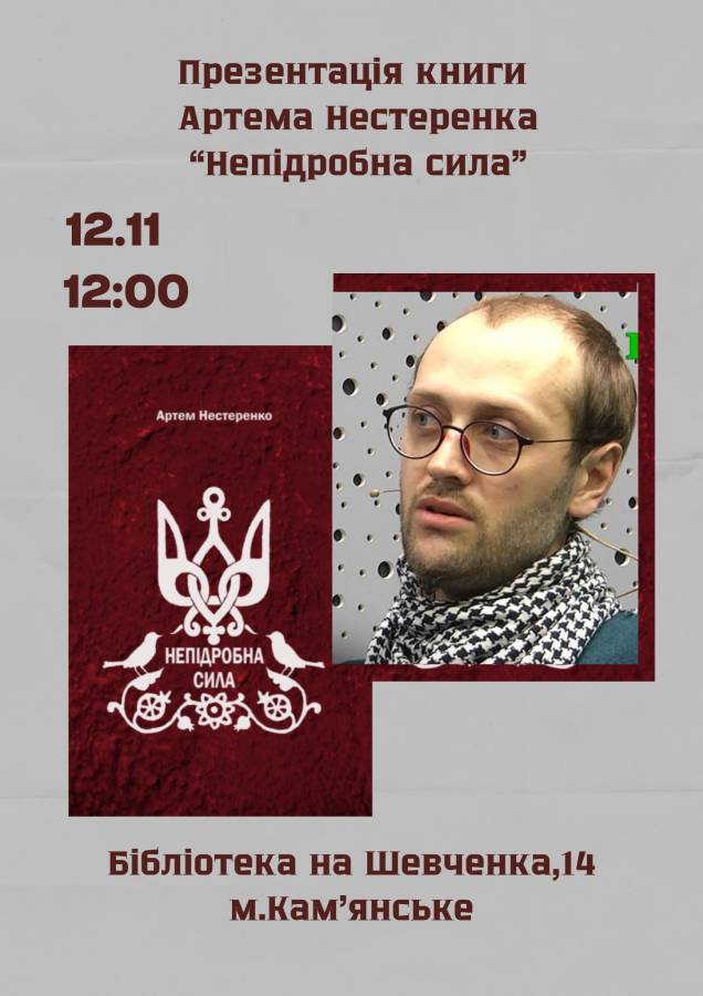 12 листопада у Бібліотеці ім. Т.Г. Шевченка відбудеться презентація книги Артема Нестеренка “Непідробна сила”. Артем Нестеренко у своїй особистості поєднує лікаря, митця й бойового медика, а його книга — це глибоке поетичне осмислення української ідентичності, мови, культури й історичних викликів, зокрема в умовах російської агресії. «Книга містить 6 частин — віршованих переважно драматичних розповідей про події в Україні й не в Україні, про різних людей у різних ситуаціях. Ви познайомитеся з колишнім послом Іспанії в Україні, який — чомусь! — переймається долею нашої Батьківщини. Потрапите на польовий обід наших воїнів на передовій. Станете свідками майже мистецької дискусії в одному з тилових міст України. А також ознайомитеся з рецептом, який українці мали б запропонувати ворогові, — щоб краще «посмакувати Україною». І дізнаєтеся врешті-решт, у чому полягає наша, українська НЕПІДРОБНА СИЛА. І все це — з неперевершеним гумором, що переплавляється то в іронію, то в сатиру, то аж у сарказм чи гротеск, засвідчуючи безперечно українське, полтавське походження автора, бо так — і до, і після Котляревського — у найгірших обставинах, перед лицем смерті можемо сміятися тільки ми» (Світлана КОЗАЧЕНКО, педагог, літературознавець, м. Зіньків)