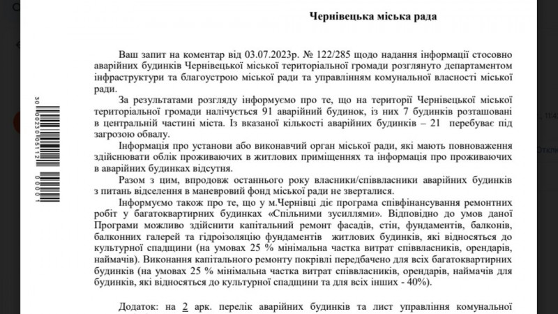 91 будинок у Чернівцях — аварійний, а 21 з них перебуває під загрозою обвалу. Мешканці цих будинків можуть звертатись до міської ради, аби їх відселили у маневровий фонд. Втім за останній рік власники та співвласники будинків не писали заяв щодо цього.